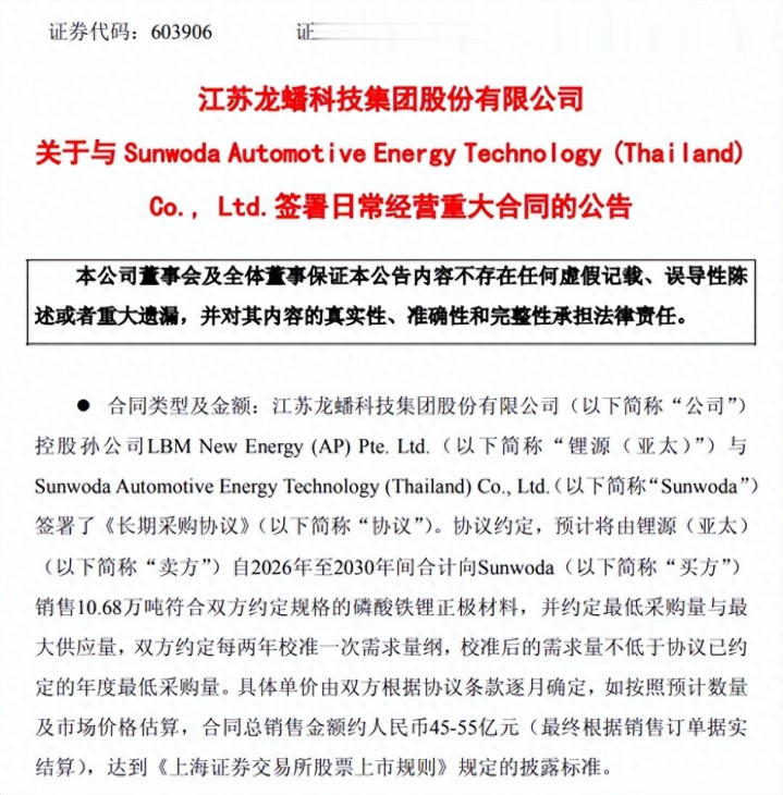 9月15日,龙蟠科技控股孙公司锂源(亚太)与宁德时代正式签署《磷酸铁锂正极材料采购合作协议》,将在2026年第二季度至2031年期间,向宁德时代海外工厂供应合计15.75万吨磷酸铁锂正极材料。